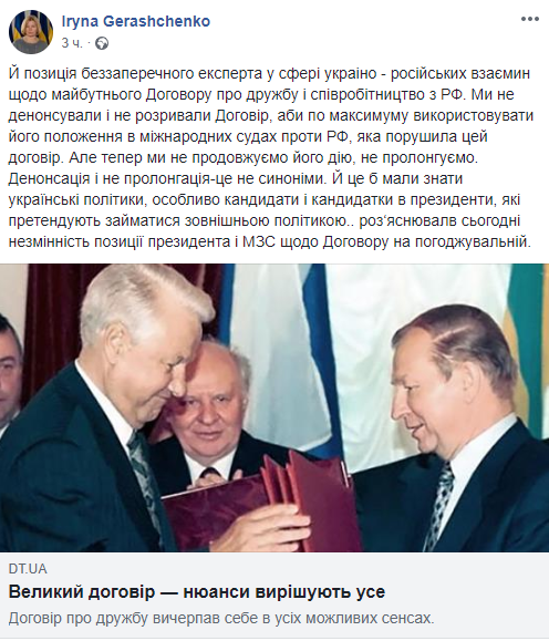 "Мы не денонсировали и не разрывали договор, чтобы по максимуму использовать его положение в международных судах против РФ, которая нарушила этот договор. Но теперь мы не продолжаем его действие, не пролонгируем. Денонсация и не пролонгация-это не синонимы" – написала Геращенко.