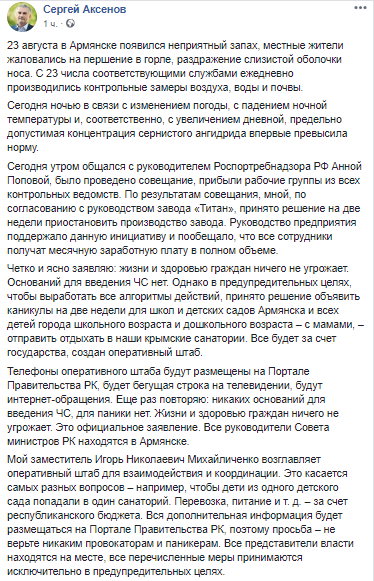 "23 августа в Армянске появился неприятный запах, местные жители жаловались на першение в горле, раздражение слизистой оболочки носа. С 23 числа соответствующими службами ежедневно производились контрольные замеры воздуха, воды и почвы", - пишет в соцсети Аксенов.