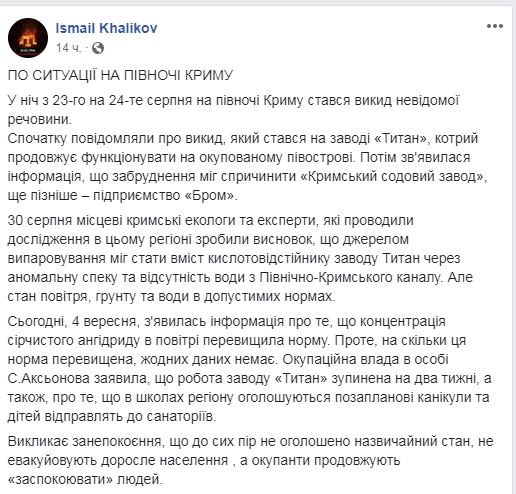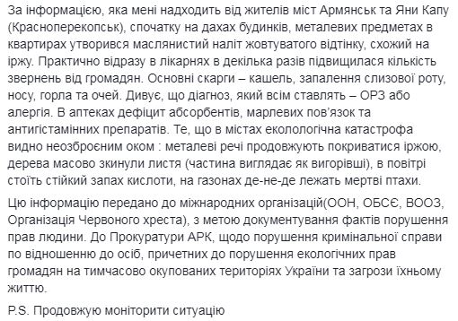 "Эта информация передана в международные организации (ООН, ОБСЕ, ВОЗ, Красный крест) - с целью документирования фактов нарушения прав человека; в прокуратуру АРК - о возбуждении уголовного дела в отношении лиц, причастных к нарушению экологических прав граждан на временно оккупированных территориях Украины и угрозе их жизни", - написал Халиков