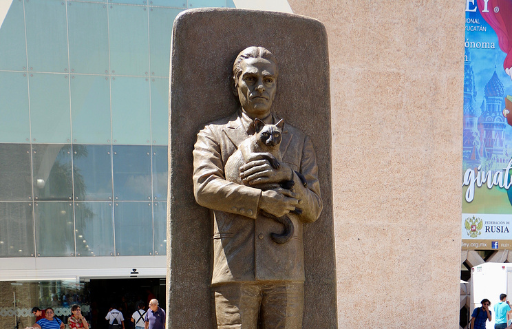 Памятник Ю.Кнорозову и его кошке в Мексике. Автором монумента стал скульптор Рейнальдо Болио Суарес Фото: ТАСС
