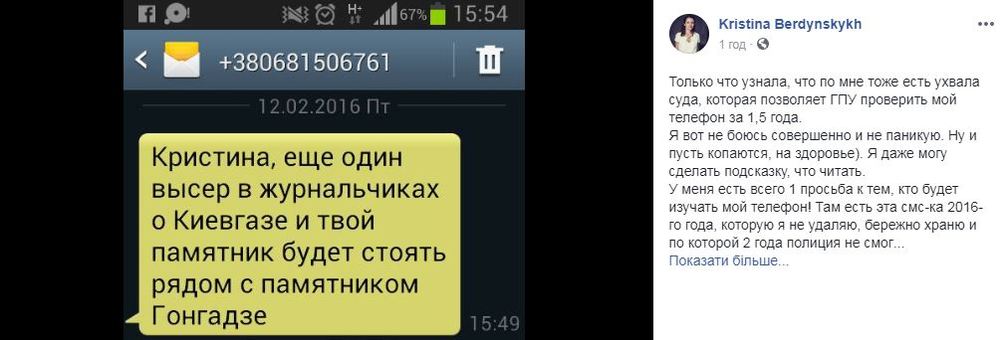 "Лариса Сарган (пресс-секретарь главы ГПУ Юрия Луценко – прим. ред.) сообщила, что по моему телефону тоже есть определение суда, аналогичное тому, что у Натальи Седлецкой… которое позволяет ГПУ проверить мой телефон за 1,5 года", - написала Бердинских в Facebook.
