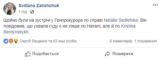 Эту же информацию подтвердила народный депутат Светлана Залищук. "Были на встрече у генпрокурора по делу Натальи Седлецкой. Он сообщил, что определение суда есть не только по Наталье, но и по Кристине Бердинских", - написала Залищук.