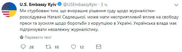 "Мы обеспокоены тем, что вчерашнее решение суда по журналистке-расследователю Наталье Седлецкой может оказать неблагоприятное влияние на свободу прессы и усилия по борьбе с коррупцией в Украине. Украинская власть должна поддерживать независимую журналистику", - говорится в сообщении, опубликованном в аккаунте посольства США в Украине в Twitter.