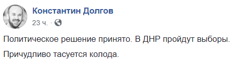 "Политическое решение принято. В ДНР пройдут выборы. Причудливо тасуется колода", - заявил он в Facebook. "Борьба за право участвовать в выборах главы ДНР обещает быть интереснее самих выборов", - позже добавил он.