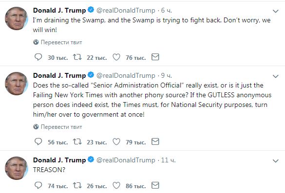 В ответ на статью NYT Трамп сначала опубликовал твит с одним лишь словом: "Госизмена?", а в следующем твите задал вопрос, "существует ли этот "высокопоставленный сотрудник администрации" в реальности". "Если этот трусливый аноним действительно существует, то во имя национальной безопасности газета должна немедленно его/ее выдать".