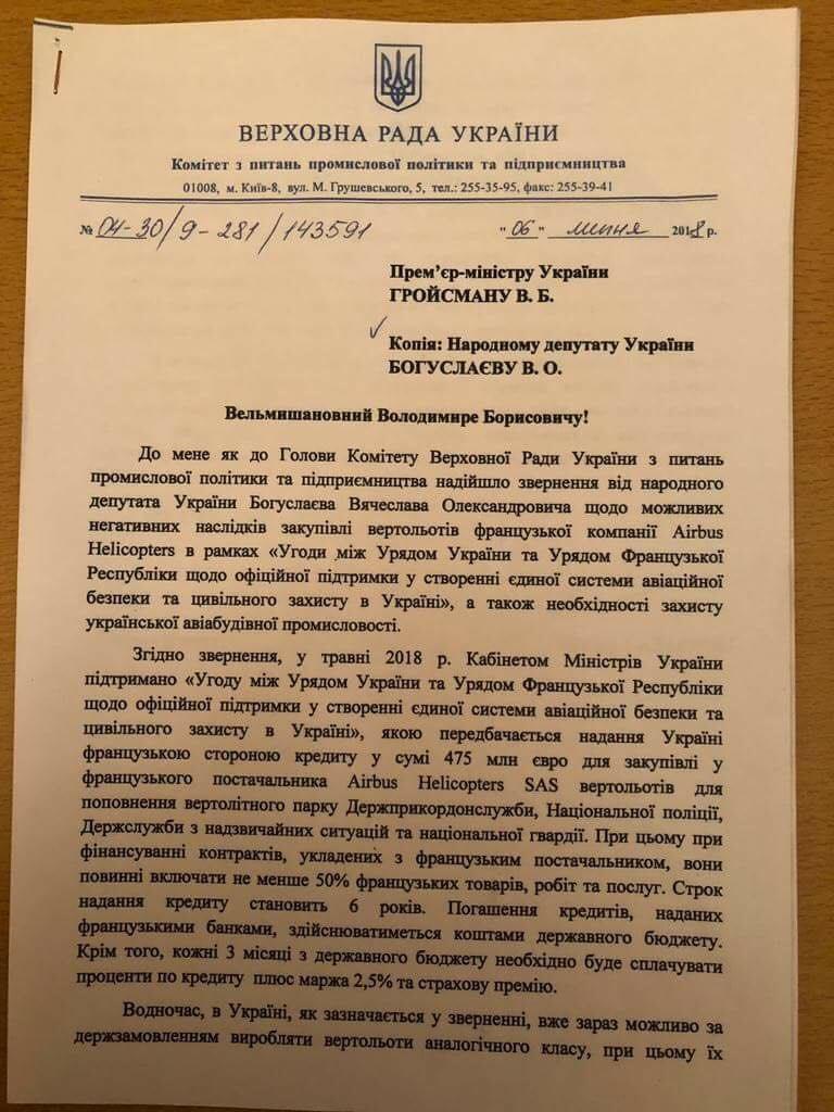 "Прошу рассмотреть это заявление и поспособствовать защите украинских авиапроизводителей с целью дальнейшего обеспечения конкурентоспособности отрасли, сохранения инвестиций в Украине, стимулирования национального высокотехнологичного производства и создания рабочих мест", - резюмируется в документе.