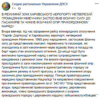 "Во время оформления рейса международного сообщения "Харьков - Дортмунд" в Харьковском аэропорту, нетрезвый гражданин Германии (1965 года рождения) применил физическую силу к представителям компании-перевозчика и пассажирам, находившимся в зале накопления в связи с отказом ему в посадке на борт из-за состояния алкогольного опьянения. К месту происшествия был вызван пограничный наряд... На требования пограничников проследовать из зала накопления мужчина оказал физическое сопротивление", - сообщили на странице Восточного регионального управления Госпогранслужбы в соцсети.