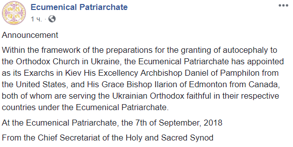 "В рамках подготовки к предоставлению автокефалии Православной Церкви в Украине Вселенский Патриархат назначил как своих экзархов в Киеве Его Преосвященство Архиепископа Даниила Памфилийского из Соединенных Штатов и Его Преосвященство епископа Илариона Эдмонтонского из Канады которые оба служат украинским православным верным в своих странах во Вселенском патриархате", - так звучит заявление, подписанное синодом Вселенской патриархии 7 сентября.