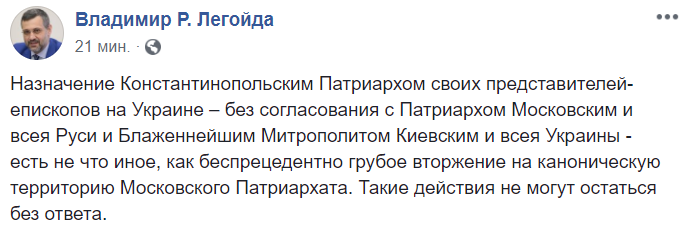 "Назначение Константинопольским Патриархом своих представителей-епископов на Украине – без согласования с Патриархом Московским и всея Руси и Блаженнейшим Митрополитом Киевским и всея Украины - есть не что иное, как беспрецедентно грубое вторжение на каноническую территорию Московского Патриархата. Такие действия не могут остаться без ответа", - обещает спикер Московской патриархии Владимир Легойда.