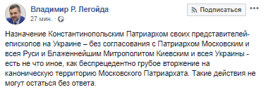 "Назначение Константинопольским Патриархом своих представителей-епископов на Украине – без согласования с Патриархом Московским и всея Руси и Блаженнейшим Митрополитом Киевским и всея Украины - есть не что иное, как беспрецедентно грубое вторжение на каноническую территорию Московского Патриархата. Такие действия не могут остаться без ответа", - написал в Facebook Легойда.