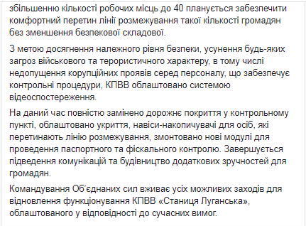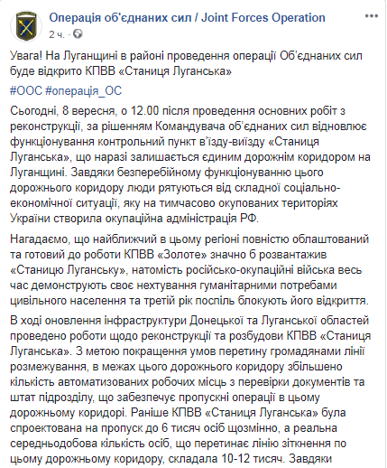 Сегодня, 8 сентября, возобновит свою работу КПВВ "Станица Луганская", который не работал со 2 по 7 сентября из-за ремонта. Об этом сообщает штаб Операции объединенных сил на странице в Facebook.