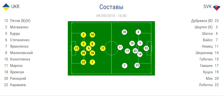 Словакия: Дубравка - защита Шатка, Шкртел, Шкриниар, Губочан - полузащита Куцка, Лоботка Мак, Гамшик, Вайсс - атака Немец.