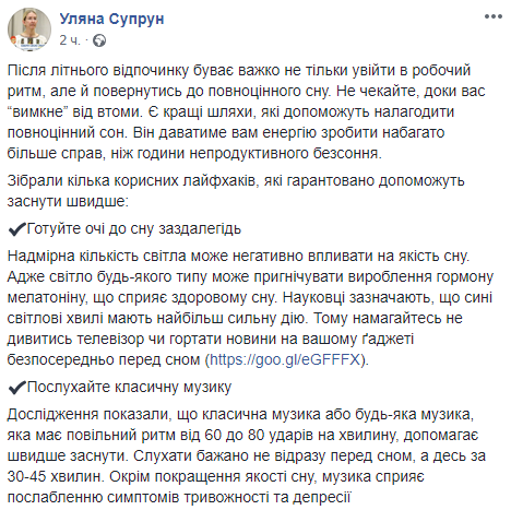 Глава Минздрава Ульяна Супрун дала советы, которые помогут войти в рабочий ритм и наладить полноценный сон после летнего отдыха. Об этом она написала на своей странице в Facebook.