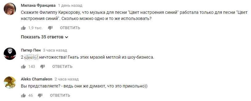 На выход ролика отреагировала певица Лолита. Она написала, что не станет смотреть "Ибицу" и вообще будет рада, если парочку лишат званий народных артистов. "У меня звания народной артистки нет, пусть и у них не будет", - рассказала она в Instagram. Певица пожаловадась, что не раз просила Гудкова написать сценарий и для нее, но он так и не исполнил просьбу. Хотя для Киркорова снял уже второй клип.