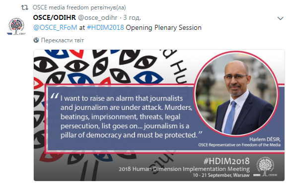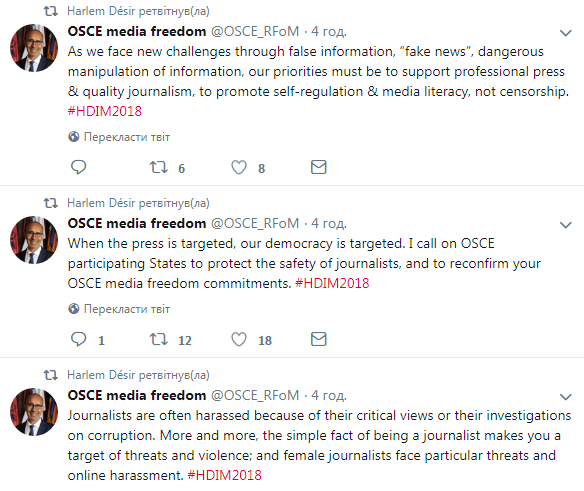 "Журналисты часто преследуются из-за их критических взглядов или расследований против коррупции. Сегодня все больше и больше, даже простой факт того, что вы журналист, делает вас мишенью для угроз и насилия; журналисты-женщины сталкиваются с особыми опасностями и онлайн-домогательствами", - констатировал спецпредставитель ОБСЕ.