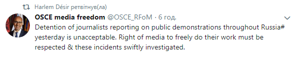 Спецпредставитель ОБСЕ по вопросам свободы средств массовой информации Арлем Дезир призвал защитить журналистику. Он констатировал, что власти, пытающиеся ограничить СМИ и распространение информации - уничтожают будущее своих государств.