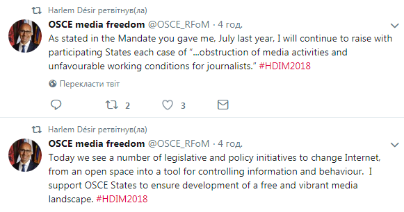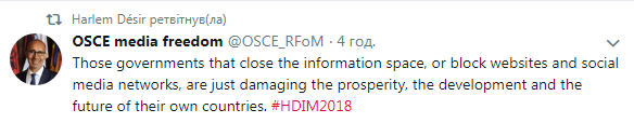 "Сегодня мы видим ряд законодательных и политических инициатив ориентированных на то, чтобы Интернет из открытого пространства превратить в инструмент контроля за информацией и поведением. Мы предоставили поддержку ряду государств-членов ОБСЕ для того, чтобы они смогли разработать лучшее регулирование и провести анализ для того, чтобы законодательные рамки поддерживали развитие свободных и динамичных СМИ". - отметил он.