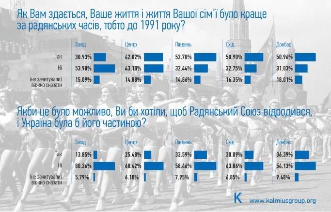 По данным социологического опроса, проведенного "Кальмиусская группой" в партнерстве с компанией GfK Ukraine, 43% населения в целом и 51% жителей Донбасса считают, что их жизнь или жизнь их семей в советские времена была лучше. С таким утверждением не согласны 42% и 31% соответственно.