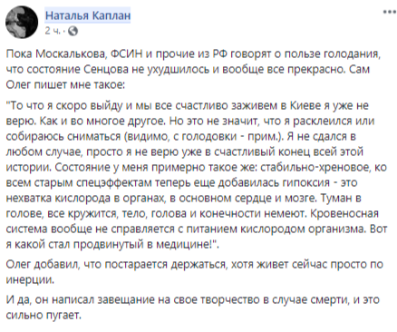 "То, что я скоро выйду и мы все счастливо заживем в Киеве я уже не верю. Как и во многое другое. Но это не значит, что я расклеился или собираюсь сниматься (видимо, с голодовки - прим.). Я не сдался в любом случае, просто я не верю уже в счастливый конец всей этой истории. Состояние у меня примерно такое же: стабильно-хреновое, ко всем старым спецэффектам теперь еще добавилась гипоксия - это нехватка кислорода в органах, в основном сердце и мозге. Туман в голове, все кружится, тело, голова и конечности немеют. Кровеносная система вообще не справляется с питанием кислородом организма. Вот я какой стал продвинутый в медицине!", – цитирует письмо Сенцова Каплан на своей странице в Facebook в понедельник вечером.