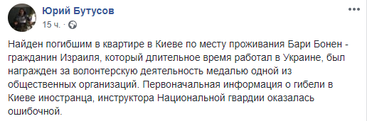 "Найден погибшим в квартире в Киеве по месту проживания Бари Бонен - гражданин Израиля, который длительное время работал в Украине, был награжден за волонтерскую деятельность медалью одной из общественных организаций", - сообщает Бутусов.