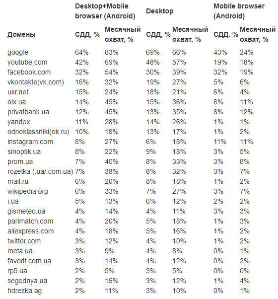 Согласно исследованию, за август ТОП-5 популярных доменов, посещаемых украинскими пользователями, не изменились. В их число вошли: Google, Youtube, Facebook, "ВКонтакте" и Ukr.Net. Так, среднедневная доля аудитории за месяц для доменов Google незначительно сократилась и составила 64%, а месячный охват аудитории - 83%. Для Youtube эти показатели составили 42% и 69%, для Facebook - 32% и 54%.