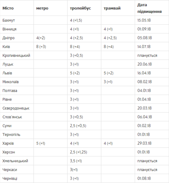 Согласно данным ассоциации, в 2018 году цены уже повысились (или планируется повышение) в 16 областных центрах страны. С 14 июля один раз проехать в столичном метро стоит 8 грн (или 6,50 грн при условии пополнения карты на 50 поездок). Аналогично (8 грн) с 14 июля стоит проезд в наземном коммунальном транспорте, городской электричке и на фуникулере.  Рост цен на проезд  в Киеве и Днепре в отдельных видах транспорта достиг 100% (с 4 до 8 грн подорожал проезд в троллейбусах и трамваях Киева и с 2 до 4 грн - проезд в метро Днепра).