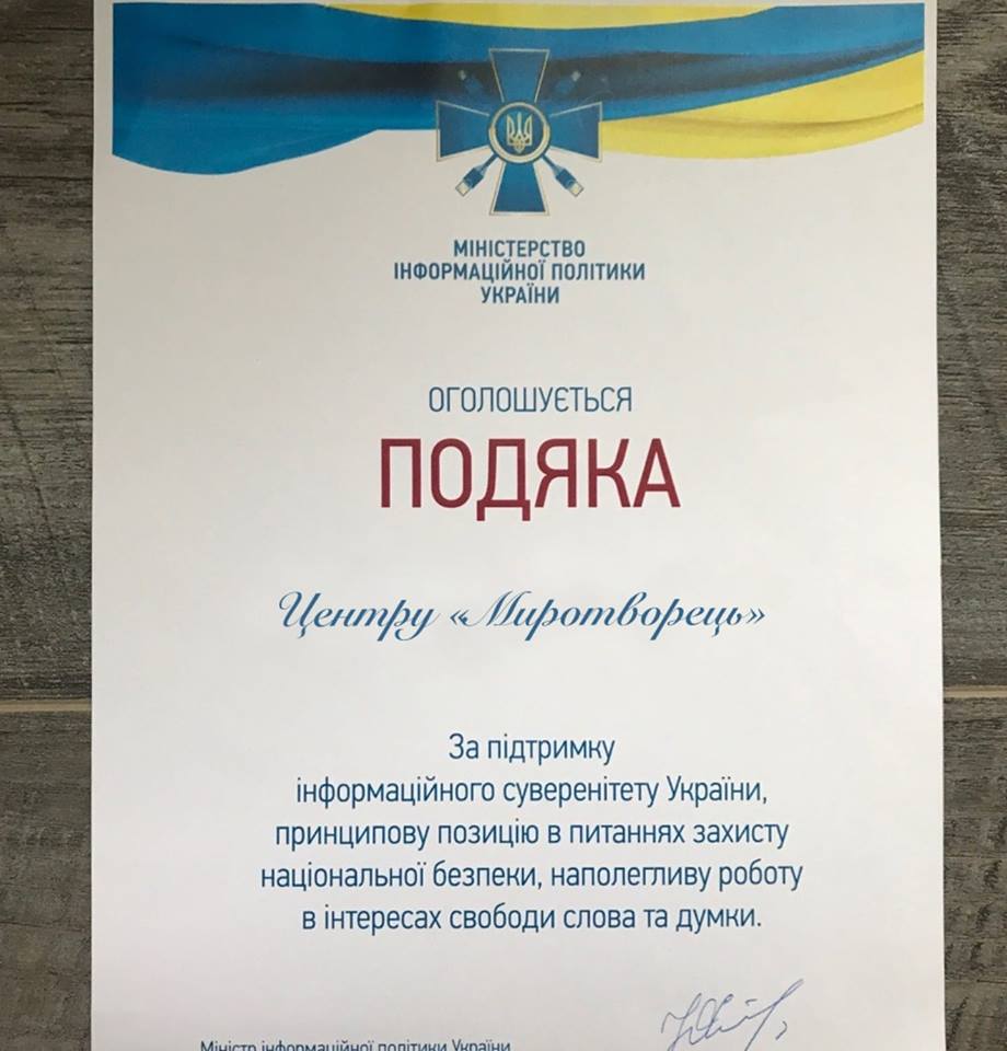 В Министерстве информационной политике сообщили, что не вручали благодарственных грамот скандально известному сайту "Миротворец", а в соцсетях кто-то нарочно распространил фейк. В комментарии "Стране" об этом сообщил замминистра, руководитель аппарата министра информационной политики Артем Биденко.