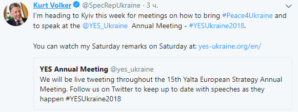 "На этой неделе я направляюсь в Киев для участия во встрече о том, как достигнуть мира для Украины и для выступления на ежегодной встрече YES-2018", - написал Волкер.