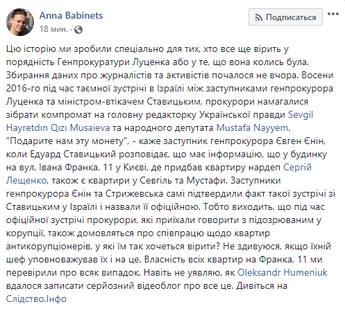 "Сбор данных о журналистах и активистов началось не вчера. Осенью 2016-го во время тайной встречи в Израиле между заместителями генпрокурора Луценко и беглым министром Ставицким, прокуроры пытались собрать компромат на главного редактора Украинской правды Sevgil Hayretdın Qızı Musaieva и народного депутата Mustafa Nayyem[...] То есть получается, что во время официальной встречи прокуроры, приехавшие говорить с подозреваемым в коррупции, также договариваются о сотрудничестве по квартирам антикоррупционеров, в которые им так хочется верить? Не удивлюсь, если их шеф уполномочивал их и на это..." - написала Бабинец.