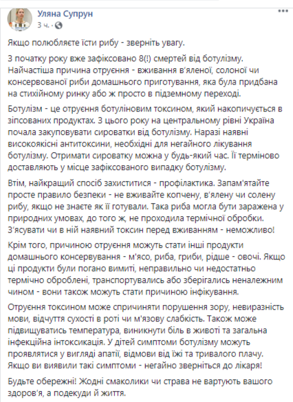 Супрун отметила, что с начала года зафиксировано 8 смертей от ботулизма, чаще всего вызванного именно употреблением рыбы, приобретенной на стихийном рынке или в подземном переходе, напомнив, что отравление токсином может вызывать нарушения зрения, невнятность речи, сухость во рту или мышечную слабость. Также может повышаться температура, возникать боль в животе и общая инфекционная интоксикация. Напомним, в Херсоне супружескую пару госпитализировали с ботулизмом, глава семьи скончался.