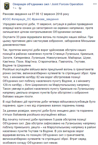 За прошедшие сутки, 11 сентября, на Донбассе в зоне проведения ООС противник 33 раза открывал огонь по позициям украинских войск.