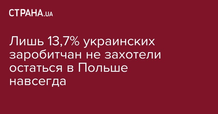 Согласно результатам социсследования, представленного в Киеве в среду, 26,3% опрошенных трудовых мигрантов из Украины готовы были бы остаться в Польше на несколько лет, 22,1% респондентов хотели бы переехать в Польшу на ПМЖ, 13,7% не хотели бы постоянно жить в этой стране, а 37,9% затруднились ответить.
