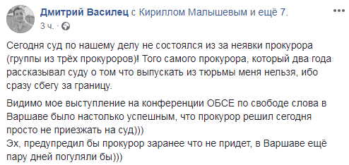 Видимо мое выступление на конференции ОБСЕ по свободе слова в Варшаве было настолько успешным, что прокурор решил сегодня просто не приезжать на суд. Эх, предупредил бы прокурор заранее что не придет, в Варшаве еще пару дней погуляли бы", - написал Василец.