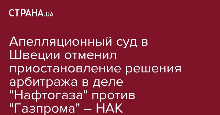 Апелляционный суд в Швеции отменил временное приостановление решения арбитража, согласно которому "Газпром" (РФ) должен НАК "Нафтогаз Украины" $2,6 млрд, сообщил главный коммерческий директор НАК Юрий Витренко.