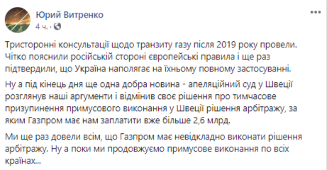 "Апелляционный суд в Швеции рассмотрел наши аргументы и отменил свое решение о временном приостановлении принудительного исполнения в Швеции решения арбитража, по которому Газпром должен нам заплатить уже более $2,6 млрд", - написал он на своей странице в Facebook.