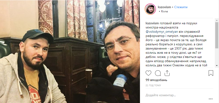 "Готов взять на поруки министра-националиста Владимира Омеляна. Он настоящий реформатор и патриот. Преследование его - это как раз месть за то, что Володя реально борется с коррупцией, а сами обвинения - это 1937 год", - написал Лозовой на своей странице в Инстаграме.