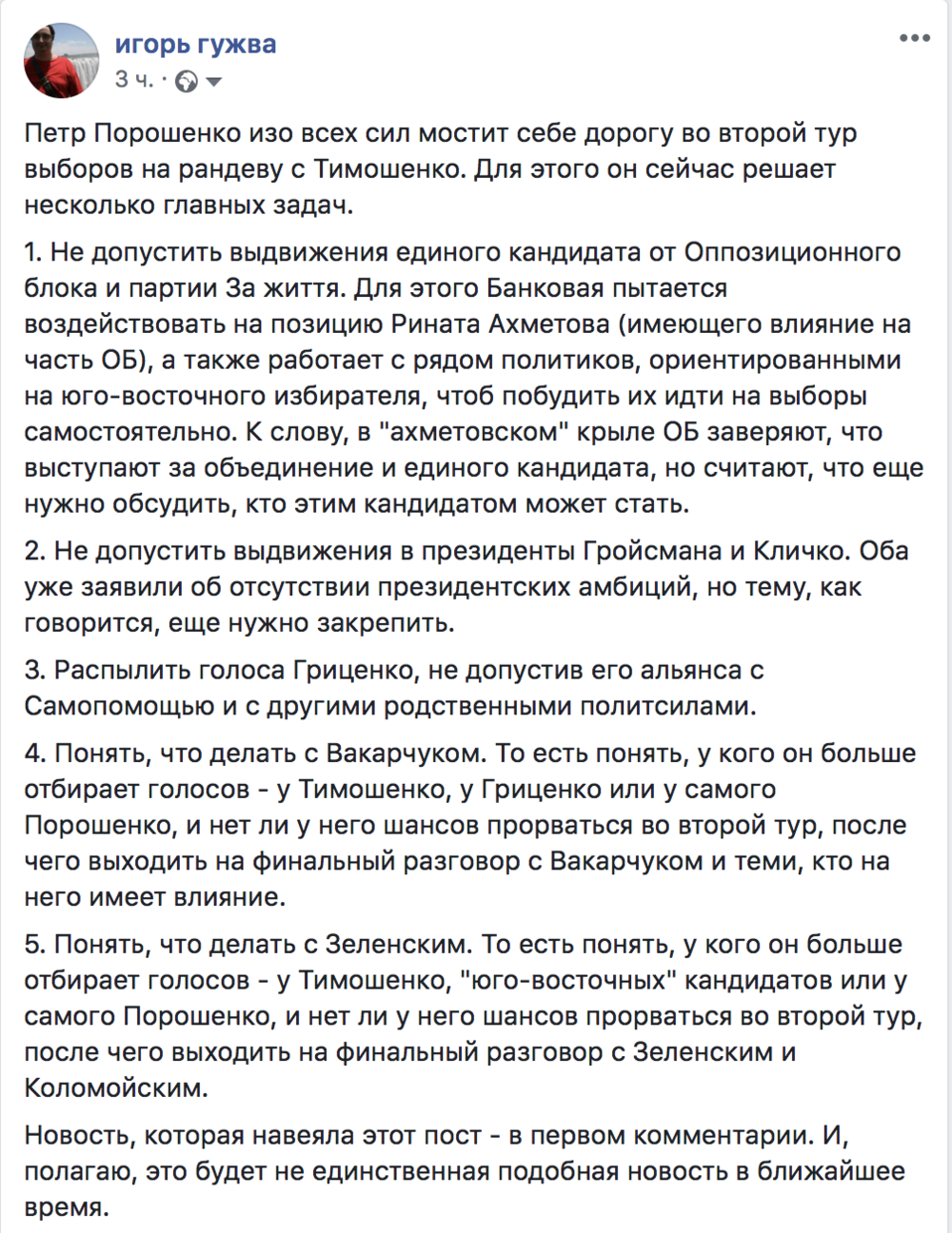 5. Понять что делать с Зеленским. То есть понять, у кого он больше отбирает голосов - у Тимошенко, "юго-восточных" кандидатов или у самого Порошенко, и нет ли у него шансов прорваться во второй тур, после чего выходить на финальный разговор с Зеленским и Коломойским.