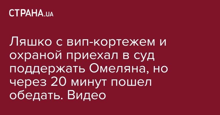 Глава Радикальной партии Олег Ляшко приехал с вип-кортежем и в сопровождении охраны в суд поддержать обвиненного в незаконном обогащении министра инфраструктуры Владимира Омеляна. Об этом написала в соцсети журналистка Алиса Юрченко, назвав эту группу поддержки самой сюрреалистичной. По словам журналистки, Ляшко пробыл в зале суда, где избирали меру пресечения Омеляну, не более 20 минут и затем вместе с сопровождающими удалился на завтрак.