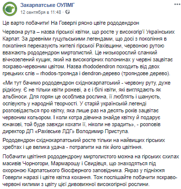 "Мы здесь видим рододендрон восточнозакарпатский - червону руту, очень редкую. Есть не только цветы розовые, а есть и белые цветы, которые выглядят как альбиносы. Для горцев это особое растение, его любят и уважают, воспевают в народном творчестве. В старой украинской легенде рассказывается о цветке, который только раз в десять лет зацветает красным цветом. И если девушка найдет цветок и подарит юноше, тот всегда любить ее, никогда не предаст", - рассказал директор ГП Раховское ЛДГ Владимир Приступа.