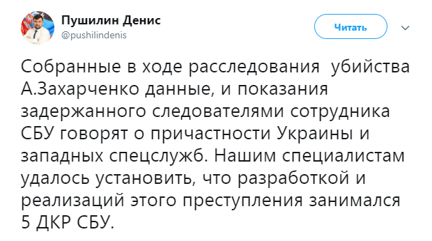"Собранные в ходе расследования убийства Александра Захарченко данные и показания задержанного следователями сотрудника СБУ говорят о причастности Украины и западных спецслужб", - написал он в сети.