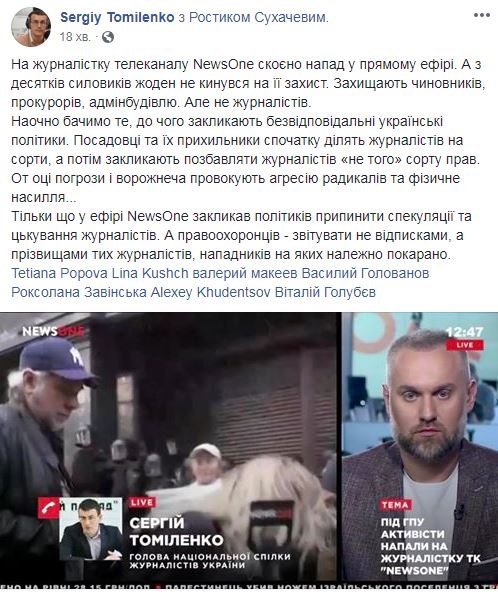 13:27 Тем временем в Национальном союзе журналистов осудили избиение девушки: "Защищают чиновников, прокуроров, админздание, но не журналистов", - пишет глава организации Сергей Томиленко.
