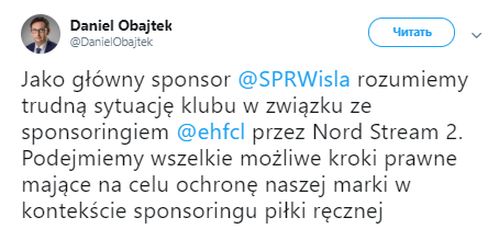 "Как главный спонсор "Висла Плоцк" понимаем тяжелую ситуацию клуба, связанную со спонсорством Лиги чемпионов "Северным потоком-2". Мы будем принимать все возможные юридические меры для защиты нашего бренда в контексте спонсорства гандбола", - написал он в Twitter.