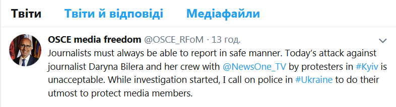 "Журналисты всегда должны иметь возможность сообщать информацию безопасным образом. Нападение на журналиста Дарину Билера и ее команду с NewsOne TV протестующими недопустимо. После начала расследования, я призываю полицию в Украине сделать все возможное, чтобы защитить представителей средств массовой информации", - написал Арлем Дезир.