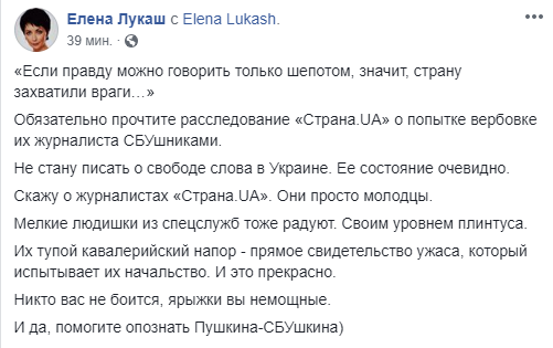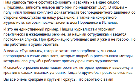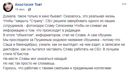 Чтобы "закрыть "Страну", СБУ решили завербовать одного из наших сотрудников - фотокорра Славу Селезнева.Чтобы он сливал им информацию о том, что происходит в редакции. В итоге "объектом", информатором, стал не Слава. А сам сбушник. Мы проследили за Пушкиным (кодовое название сбушника - потому что Саша и бакендабры), узнали, как он выглядит, на чем ездит, и записали на диктофон, как он пытался заставить Славу работать на СБУ. В лучшем стиле КГБистов. На месте Славы мог оказаться каждый. Но нас так просто не сломаешь. Горжусь, что работаю с такими смелыми и преданными коллегами".