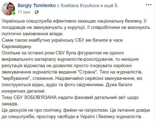 Глава Национального союза журналистов Украины Сергей Томиленко считает, что СБУ обязана предоставить профессиональный подробный отчет, поскольку это вопрос доверия к спецслужбе, пространства свободы в Украине и безопасность журналистов.