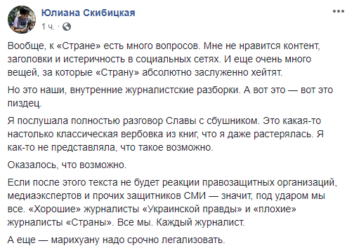 Если после этого текста не будет реакции правозащитных организаций, медиаэкспертов и прочих защитников СМИ — значит, под ударом мы все. "Хорошие" журналисты "Украинской правды" и "плохие" журналисты "Страны". Все мы. Каждый журналист. А еще — марихуану надо срочно легализовать".