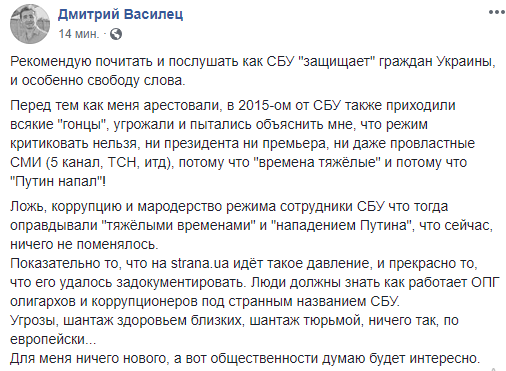 "Рекомендую почитать и послушать как СБУ "защищает" граждан Украины, и особенно свободу слова. Перед тем как меня арестовали, в 2015-ом от СБУ также приходили всякие "гонцы", угрожали и пытались объяснить мне, что режим критиковать нельзя, ни президента ни премьера, ни даже провластные СМИ (5 канал, ТСН, итд), потому что "времена тяжёлые" и потому что "Путин напал"! Ложь, коррупцию и мародерство режима сотрудники СБУ что тогда оправдывали "тяжёлыми временами" и "нападением Путина", что сейчас, ничего не поменялось.