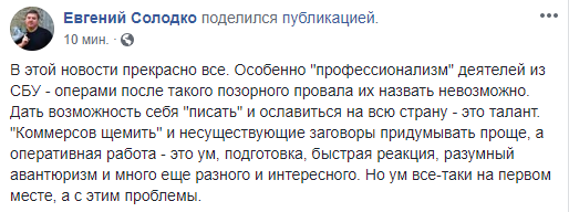 "В этой новости прекрасно все. Особенно "профессионализм" деятелей из СБУ - операми после такого позорного провала их назвать невозможно. Дать возможность себя "писать" и ославиться на всю страну - это талант. "Коммерсов щемить" и несуществующие заговоры придумывать проще, а оперативная работа - это ум, подготовка, быстрая реакция, разумный авантюризм и много еще разного и интересного. Но ум все-таки на первом месте, а с этим проблемы".