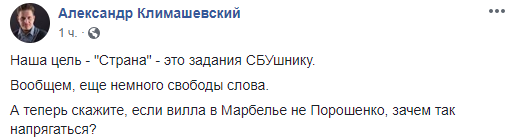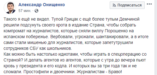 "Такого я ещё не видел. Тупой Грицак с ещё более тупым Демчиной решили подсунуть своего крота в издание Страна, чтобы собрать компромат на журналистов, которые сняли виллу Порошенко на испанском побережье. Вербовали, угрожали, шантажировали, а в итоге сами стали мишенью для журналистов, которые запетутрушили сотрудников СБУ как школьников.