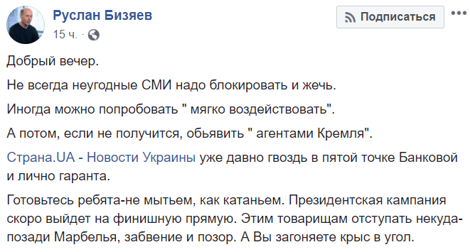 Готовьтесь ребята-не мытьем, как катаньем. Президентская кампания скоро выйдет на финишную прямую. Этим товарищам отступать некуда-позади Марбелья, забвение и позор. А Вы загоняете крыс в угол", - пишет журналист Руслан Бизяев.